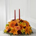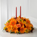 The FTD® Bright Autumn™ Centerpiece spins the magic of the Fall season with each sun-kissed petal to set your gathering space aglow with blooming beauty. Two taper candles are surrounded by a gorgeous arrangement consisting of orange Asiatic Lilies, gerbera daisies, and roses with golden Peruvian Lilies, burgundy cushion poms and assorted greens to create the perfect addition to your Autumn celebration.