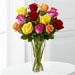 This spirited bouquet holds roses in bold hues - hot pink, orange, red and bright yellow. Certain to be an attention-getter! These vivacious roses are arranged with seeded eucalyptus in a clear glass vase.