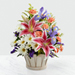 The FTD® Wondrous Nature™ Bouquet is bountifully bedecked with a dazzling display of color and beauty. Stargazer lilies stretch their fuchsia petals out amongst an arrangement of blue iris, white traditional daisies, orange mini carnations, purple statice, and yellow solidago in a round whitewash handled basket, creating a delightful bouquet your special recipient will adore.