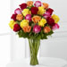This spirited bouquet holds roses in bold hues - hot pink, orange, red and bright yellow. Certain to be an attention-getter! These vivacious roses are arranged with seeded eucalyptus in a clear glass vase.